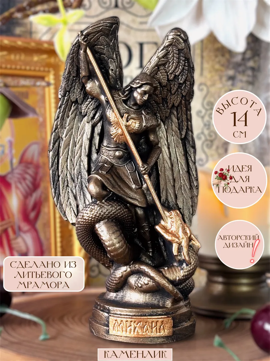 Изящная статуэтка Архангел Михаил выполнена из мрамора с использованием ручной работы, что придает ей особую ценность и уникальность. Этот образ святого, известного в православии как защитник и покровитель, воплощен с тщательным вниманием к деталям, подчеркивая духовность и силу. Изготовленная с применением литьевого метода, статуэтка сочетает в себе прочность материала и аккуратность исполнения.