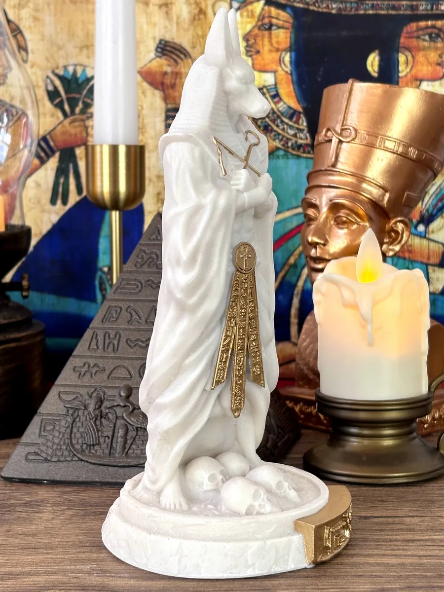 Анубис, бог смерти и защиты, изображен в виде человека с головой шакала, что делает эту статуэтку поистине впечатляющей. Она привлекает внимание своей неповторимой эстетикой и детализацией.