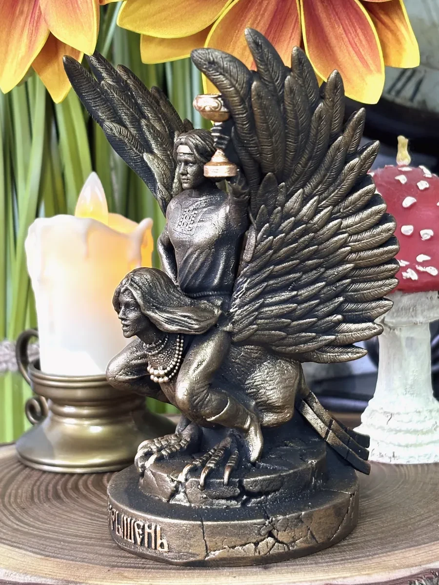 Кроме того, статуэтка изображает Гамаюн — верную помощницу бога. Эта волшебная птица с головой женщины известна своим даром предсказания будущего. Образ Гамаюн в сочетании с богом Крышень усиливает защитные свойства изделия, делая его не только красивым, но и значимым. Вы можете разместить статуэтку на рабочем столе или в гостиной, и она будет ежедневно напоминать о важности духовной связи с природой и предками.