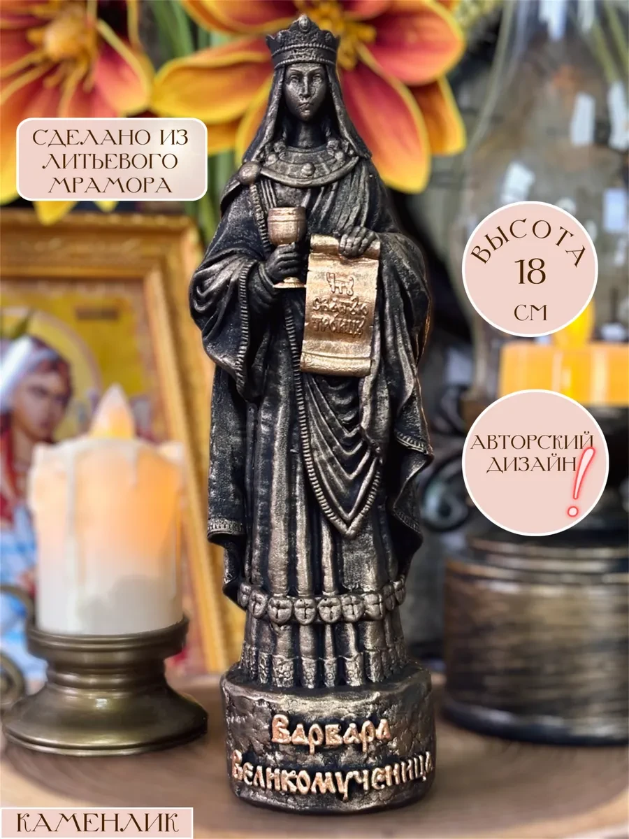 Фигурки, изображающие православных святых, всегда занимают особое место в интерьере, помогая создать атмосферу уюта и душевного спокойствия. Работа выполнена из литьевого мрамора, что придает изделию прочность, приятную фактуру и эстетичный внешний вид. Изящная фигурка посвящена великомученице Варваре, которая почитается как защитница в христианстве и считается одной из самых известных Илиопольских святых.